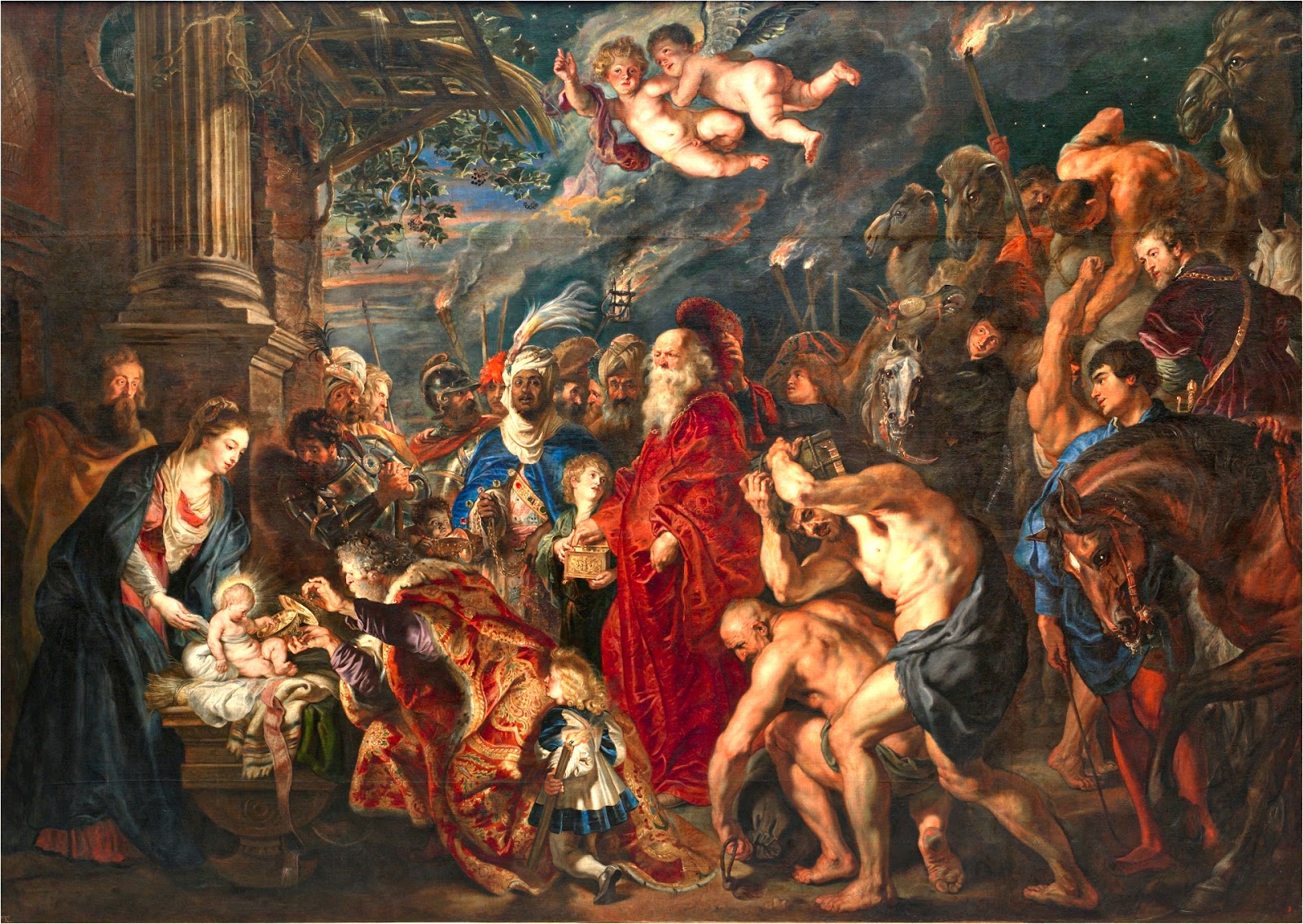 Iconográficamente, el cuadro representa el momento en el que los tres reyes, acompañados de un gran cortejo, presentan sus regalos al Niño Jesús, Melchor el europeo, oro como rey; Gaspar el asiático, incienso como Dios y Baltazar el africano, mirra como hombre.